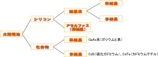 �@���z�d�r�̍ޗ��Ǝ�ނ͏�L�̐}�̂悤�ɂȂ�܂��B �@���z�d�r�̎�ނƂ��ẮA�V���R�������̂��ޗ��Ɏg�p������̂Ɖ����������̂��ޗ��ɂ�����̂ɑ�ʂ���A����ɃV���R�������̂ɂ����̂́A�����n�ƃA�����t�@�X�i���n�j�ɕ��ނ���܂��B�J�����̂��̂��܂߂�Ƃ���ɑ���ɂ킽��܂��B �@���z�d�r�̋Z�p�J���ɂ��ẮA�ϊ������̌����R�X�g�_�E���Ȃǂ��}���Ă��Ă���A����ɃV���R������щ����������̑��z�d�r�̗����ɂ����āANEDO�i�V�G�l���M�[�E�Y�ƋZ�p�����J���@�\�j�ł͕ϊ�����20 %���鑾�z�d�r�J����R�X�g�_�E�����\�Ƃ��锖�����z�d�r�̊J���Ȃǂ��s���Ă��܂��B |